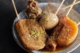Shizuoka oden, loved by locals, is a unique style of black soup with black fish cakes, beef tendons, eggs, etc. skewered on a skewer.